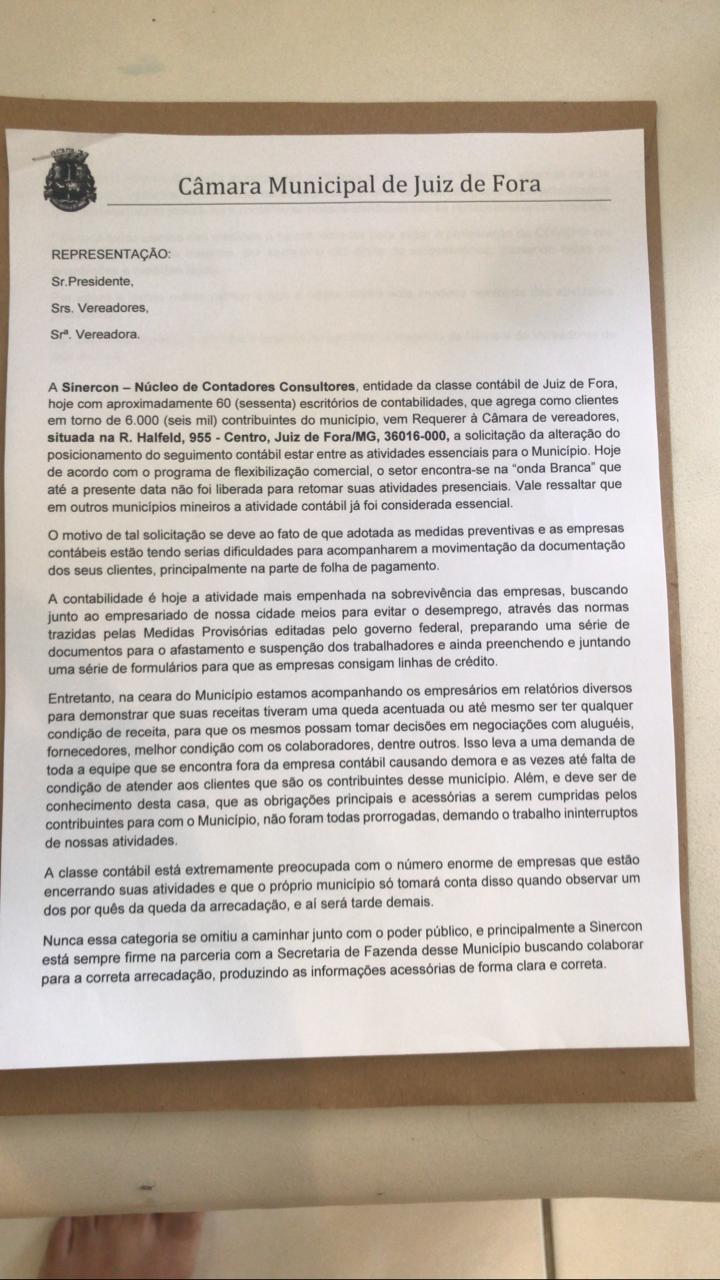Após essa conversa com os associados o Vereador Marlon Siqueira recebeu o pedido da SINERCON (vide anexo) e assumiu o compromisso de intermediar reunião com a Secretaria de desenvolvimento econômico de Juiz de Fora e lutar para que a Câmara do Município de Juiz de Fora faça as intervenções necessárias junto ao programa Minas Consciente para colocar os escritórios de contabilidade no rol de serviços essenciais no Estado de MG.